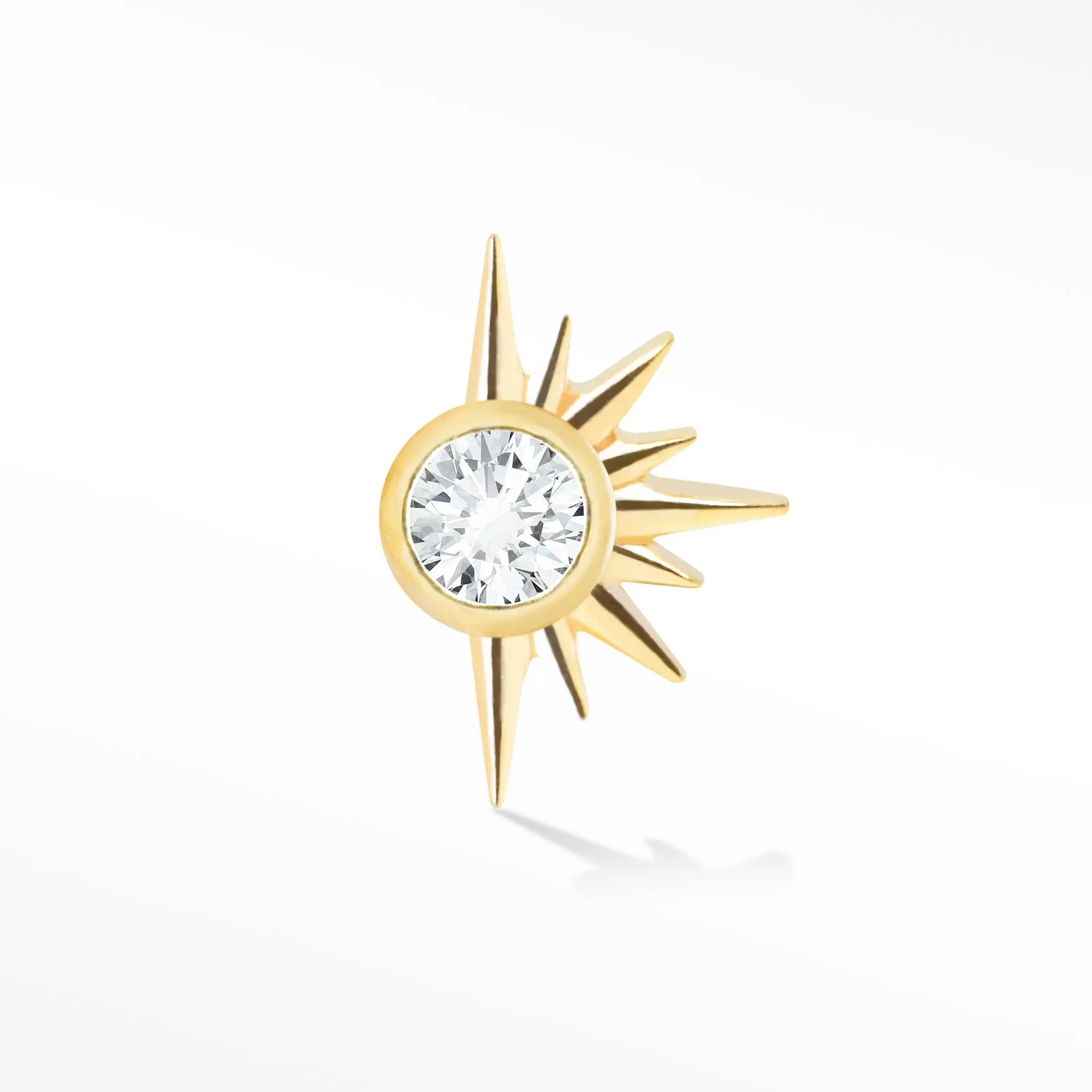 Designed with a radiant demi star silhouette, this piece centers around a brilliant-cut diamond set in warm 14K yellow gold, capturing light with refined intensity. The sculptural rays add a subtle celestial edge, while the flat back design rests smoothly against the ear for secure, all-day comfort. Elegant yet distinctive, it shines beautifully worn alone or layered into a modern ear stack for understated brilliance.