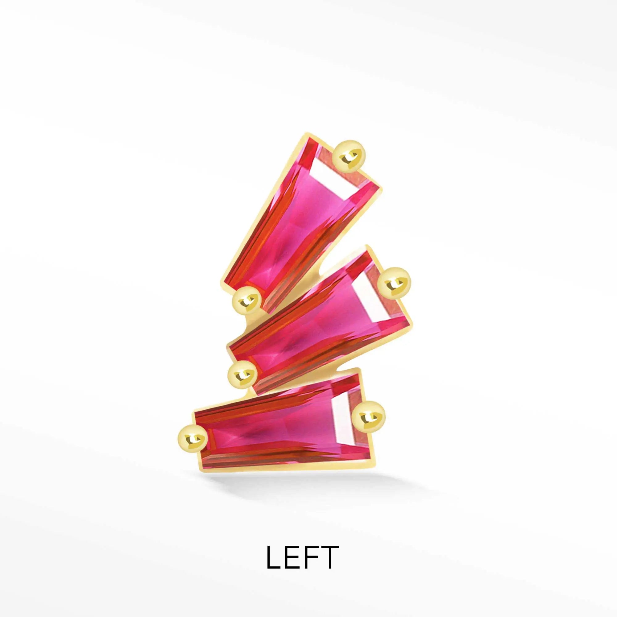 Soft pink sapphires, cut in delicate baguette shapes, rest gracefully within warm 14K yellow gold, reflecting a gentle glow with every movement. Their subtle blush tones create a quiet sparkle—romantic, refined, and effortlessly elegant. Designed with a smooth flat back profile, the piece sits comfortably against the ear, allowing its feminine charm to unfold naturally from day to evening