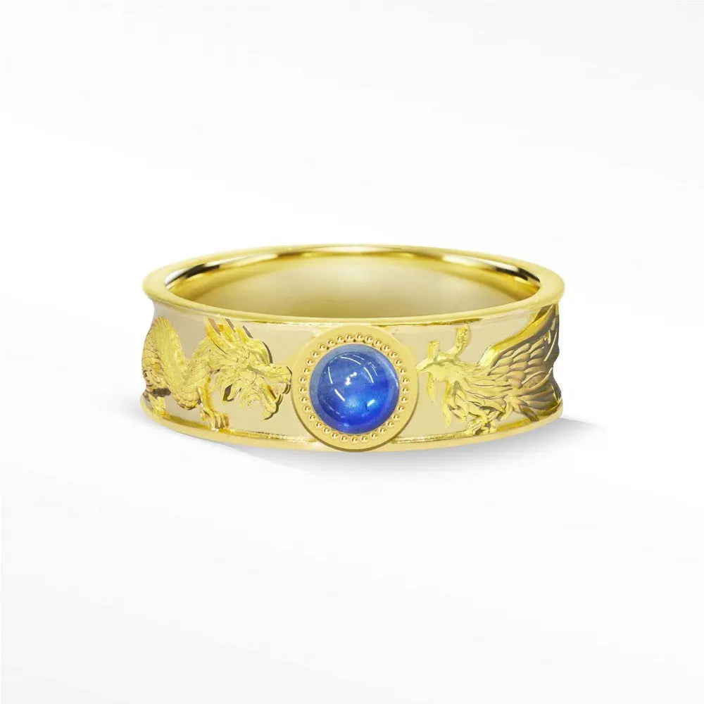 The Dragon Phoenix Sapphire Ring 14K Gold is an exquisite blend of elegance and meaning. Crafted in 14K gold, this stunning ring features a 4mm natural blue sapphire with a total carat weight of 0.4. Known for its stunning hues that range from pastel to deep midnight blue, sapphire is revered for its durability and brilliance. This ring's 7mm band adds a bold, sophisticated touch, making it a perfect choice for those who appreciate both beauty and symbolism. As the birthstone for September, sapphire is also associated with nobility, loyalty, and fidelity, making this ring an ideal choice for special occasions like engagements or anniversaries.