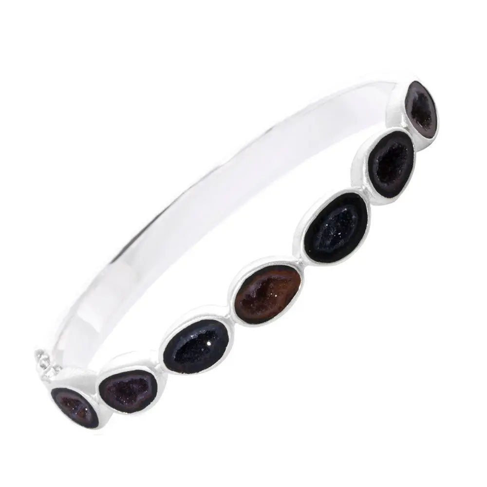 Natural Geode: A unique stone found at least 100 feet below the earth's surface, gem-quality geodes have a hard, unremarkable rock shell with insides that reveal a variety of glistening quartz crystals and often secondary minerals or formations such as hematite, calcite, apatite, stalactites and galena crystals, just to name a few.