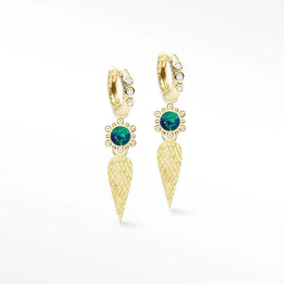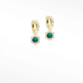 Opal earrings in a variety of styles are some of the most popular options. You can find natural opal earrings with stud backings, gold or sterling silver dangle earrings, or a pair with a hoop design. The Paradiso Doublet style has a complete ring of diamonds around the gorgeous central stone. Choose from a selection of diamond-studded hoop earrings in 18k gold with Shelley Opal dangles included.