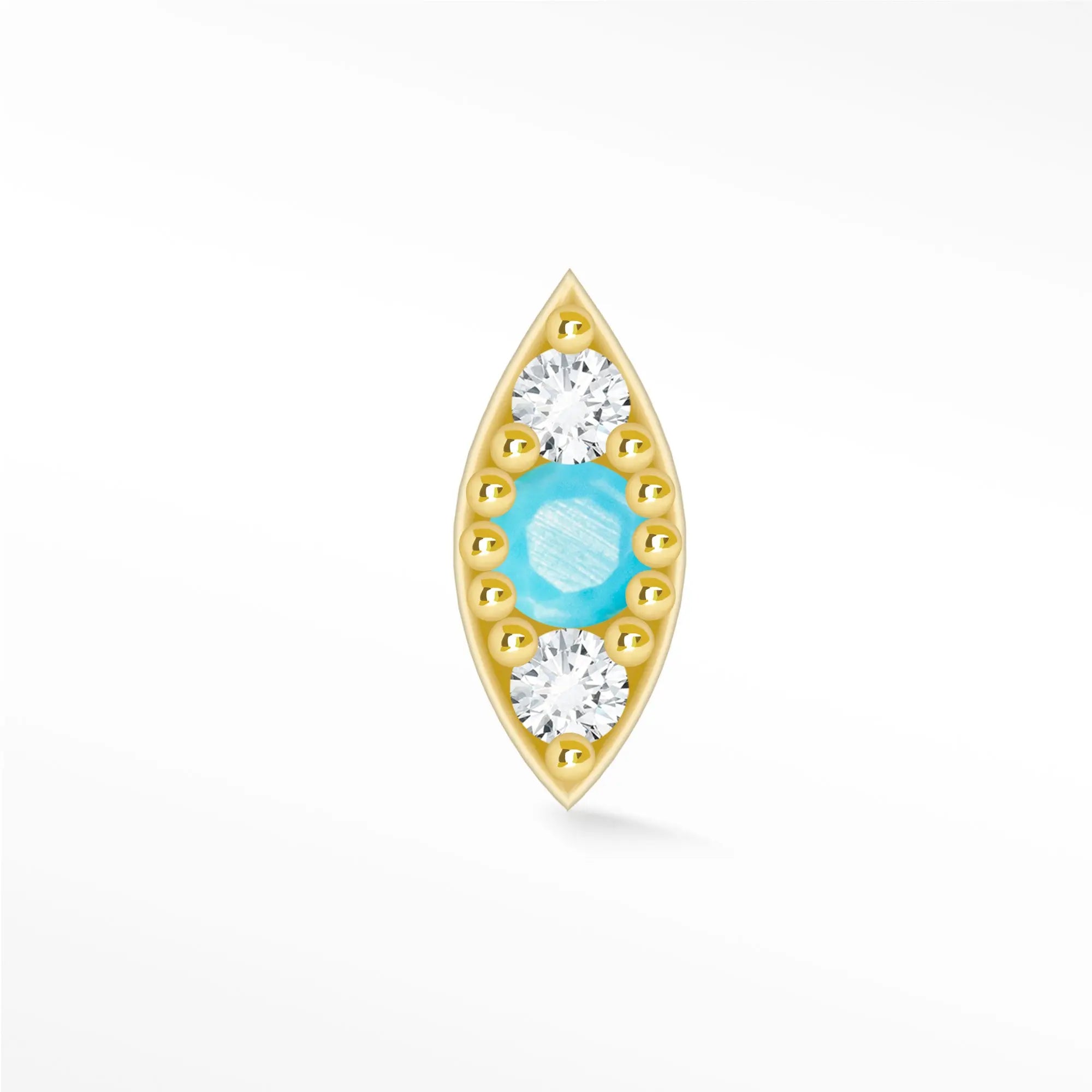 At the center, a vivid turquoise stone forms the watchful eye, delicately framed by diamonds that add subtle brilliance and depth. Set in warm 14K yellow gold, the elongated silhouette feels sleek and intentional, balancing ancient symbolism with modern elegance. The smooth flat back rests comfortably against the ear for all-day wear—whether worn alone as a meaningful accent or layered seamlessly into a curated ear stack. A refined talisman symbolizing protection, confidence, and timeless allure.