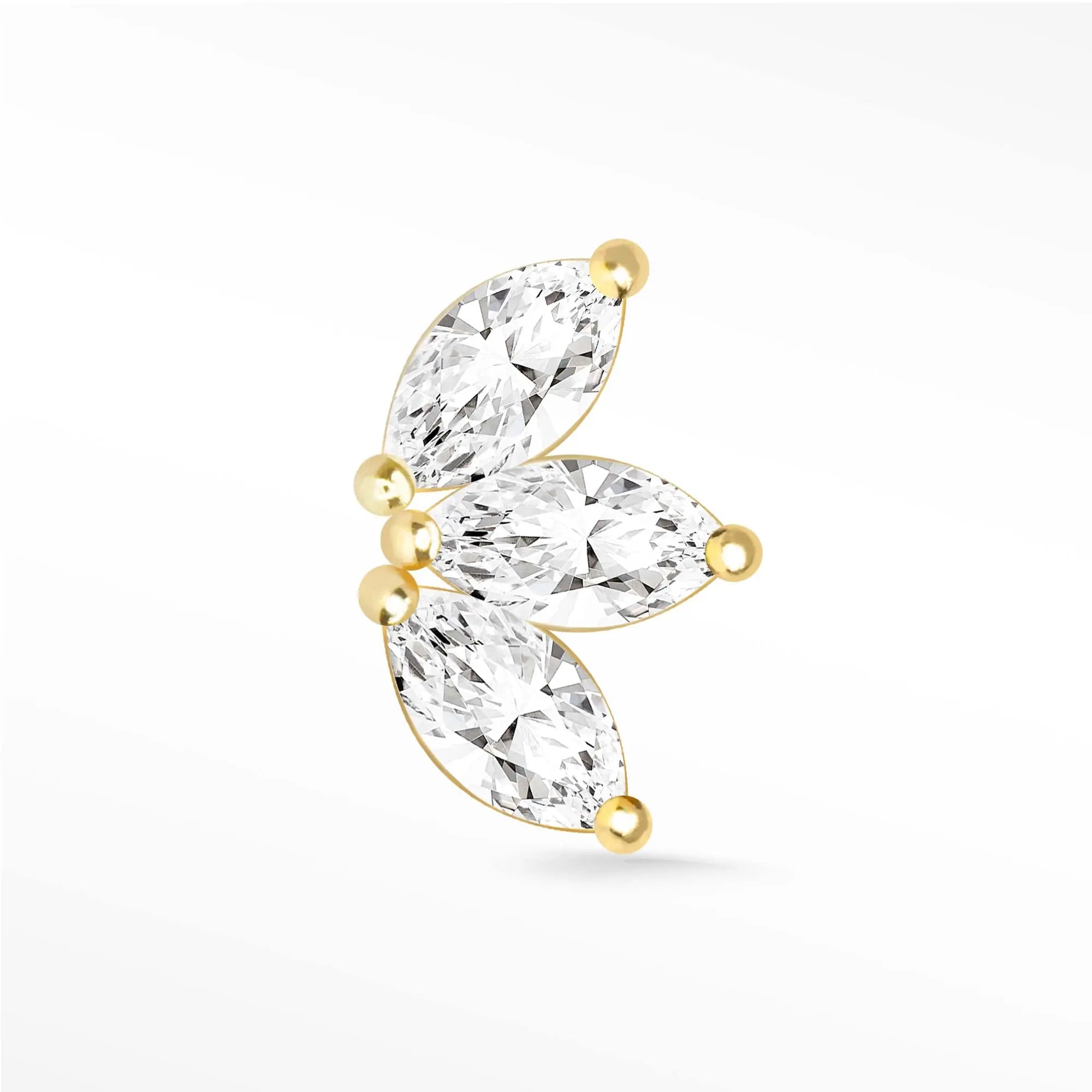 Inspired by the delicate beauty of a three-petal lotus, this refined design highlights the radiant fire of marquise-cut moissanite set in warm 14K yellow gold. The sculpted petals shimmer softly with every movement, while the smooth flat back offers a secure, barely-there feel for seamless day-to-night wear. Minimal yet expressive, it adds a gentle touch of romance and modern elegance to any curated ear look.