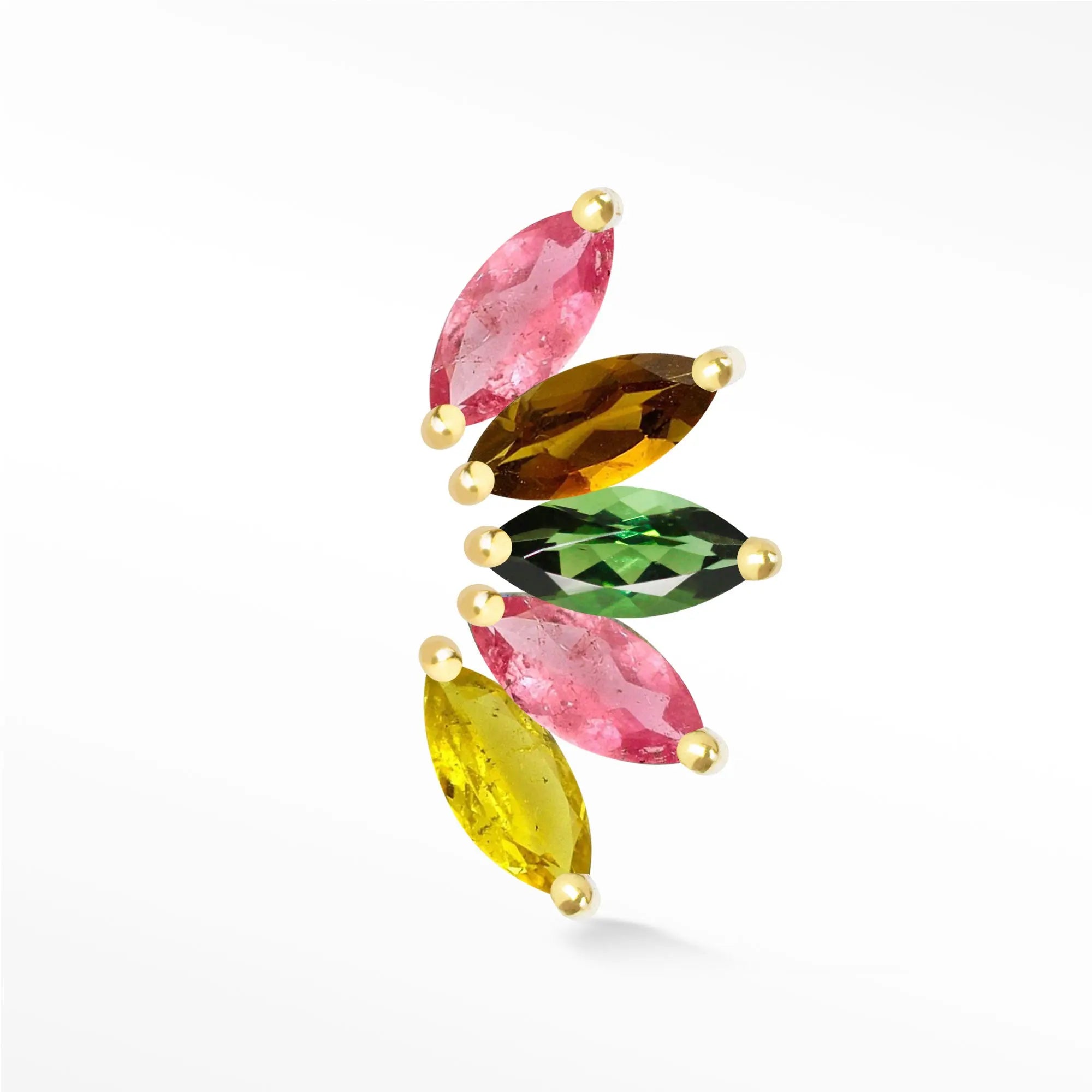 A sculptural lotus bursts into color as marquise-cut tourmalines radiate outward in a vibrant floral composition. Set in warm yellow gold, the design feels confident and expressive, celebrating contrast, movement, and individuality. The smooth flat back ensures comfortable wear, making this piece a striking statement worn solo or layered with intention.